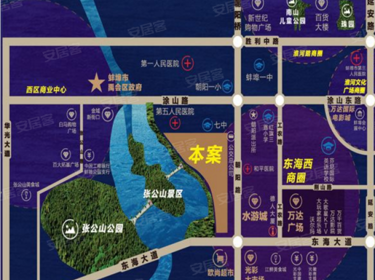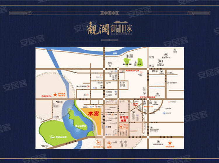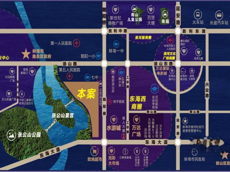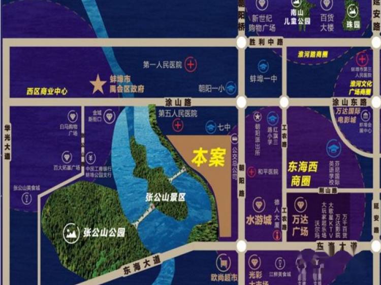 观澜御湖世家项目总用地面积约13万㎡,总建筑面积32万㎡,分别设有高层住宅、临湖别墅、风情商业街及soho等建筑形态。项目规划建有社区集中商业、中轴景观广场、大型地下车库、幼儿园等配套设施,打造成蚌埠新地标、品质社区。 蚌埠汉阳造置业有限公司开发的观澜御湖世家项目位于蚌埠市禹会区朝阳路与东海大道交汇处。项目东临朝阳路,南面为东海大道,西面为国家4A级风景区——张公山公园,北面为红旗四路。项目周边综合配套资源丰富,万达广场、欧尚超市、水游城等大型商业配套环绕左右。