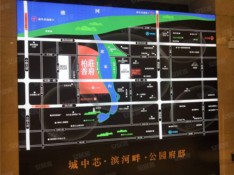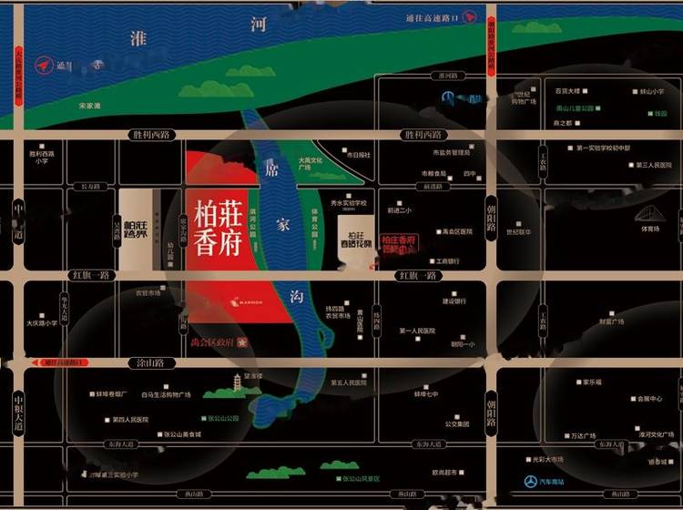 柏庄香府项目位于大庆三路与席家沟景观公园交汇处,紧邻席家沟景观公园,处于禹会滨河西片区的核心位置。建设中的滨河西片区将被打造成一个集合现代商业、高档住区、景观公园、现代路网的新城。项目北侧到达城市主干道胜利路,交通便利。项目南侧步行5分钟便是禹会区政府,根据政府周边发展趋势,以后必然成为禹会区核心规划发展新中心。步行10分钟是国家AAAA级景区张公山公园,西侧是建设中的席家沟景观公园,这里依山傍水,是您茶余饭后休闲散步的好去处。由于项目地处老城区,周边不仅有大型商业、酒店、超市、百大电器、纬四路农贸市场、张公山白马商城、金街口商圈等成熟商圈集特色餐饮、娱乐休闲、小资文化、健身美容、养生会所等于一体,。交通出行102、104、111、120、121、116等多条公交和怀远301、302城际公交站,举步即达。便利交通畅达全城,周边配套设施完善,生活琐事轻松搞定。 项目总建筑面积约12万方,由5栋24-34层的高层住宅并配以5栋9层精品洋房组成,总户数约870席,绿地率高达40%以上,建筑面积70-160平米户型,可以满足不同需求。共有874个机动车位,地上257个,地下617个,人车分流的设计让老人和儿童放心的在小区里散步嬉戏。