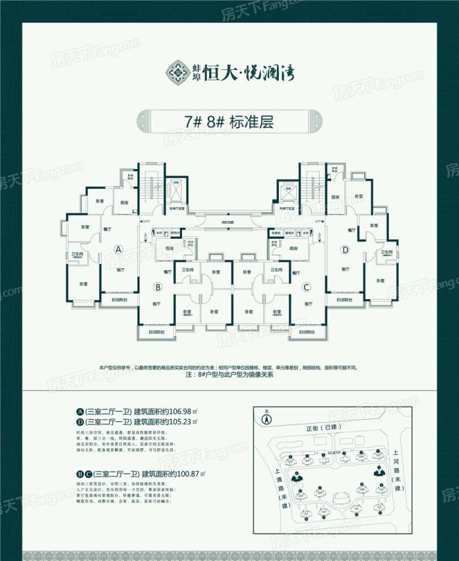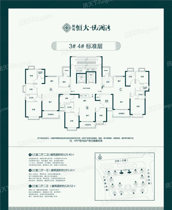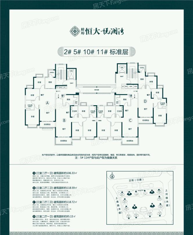 蚌埠·恒大悦澜湾是由世界500强企业(2019《财富》第138位)、中国标准化精品地产领导者、中国龙头房企、香港著名上市公司“恒大地产”在蚌埠投资开发的第四个精品项目,也是恒大集团在蚌埠的排名前列个新中式项目。 项目位于淮上区上河路西侧、滨河路北侧,是蚌埠大建设的主战场,更是重点打造的蚌埠发展“南进北拓”的大方向之一;周边人文荟萃,2公里范围内汇集幼儿园、小学、初中、高中等;加之规划中的云轨2号线途经项目北侧,接驳繁华,未来可期。 项目总体占地面积约294亩,规划总建筑面积约45万㎡,为居住、商住、商业用地,商住比例为1:5 。项目由10栋26层高层住宅、7栋23层高层住宅、4栋16层高层住宅、8栋10层洋房、6栋8层洋房、2栋17层公寓、一栋2层的综合楼、1个书店、1个商业街区组成。总规划户数2372户,容积率为1.7,绿化率约34.6%,建筑密度为40%。车位与住户比例为1:1.5,总停车位为3326,并设有非机动车停车位4551。 蚌埠·恒大悦澜湾,恒大蚌埠第四子,是恒大安徽公司深耕珠城8年集大成之作,也是恒大集团在安徽的升级新中式巨筑。传承恒大22载精装豪宅及实景园林匠造经验,坐享醇熟配套,恢宏匠筑约7万方立体国风园林、满屋名牌9A精装、3万方商业街区、多功能会所、新风除霾系统等。以自然生态为主,将蚌埠地方人文与中国园林精萃相结合,缔就一城回归中国宅院的传世府邸,敬献珠城人民!