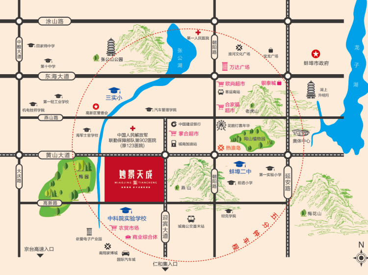 妙景天成项目位于蚌埠市两大交通主干道——黄山大道和迎宾大道交叉口的西南侧位置,属于蚌埠城市发展的重要区域,地理位置非常优越。项目周边公交线路有122路、130路、140路、215路、机场专线等多条公交线路可以到达蚌埠的大部分区域。沿黄山大道向东车行5-10分钟可到奥体中心、新二院、湖上升明月,15-20分钟可达大明文化园、高铁南站;路段内3公里依次可到达客运南站、光彩大市场、欧尚超市、万达、银泰商业综合体等。