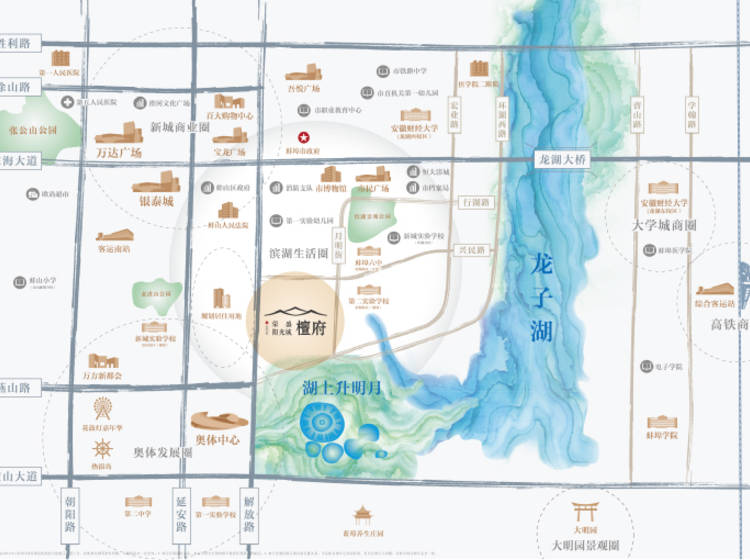 荣盛阳光城·檀府位于滨湖板块与城南板块交接处,既可享滨湖新区商业、娱乐、教育、政务等配套,又坐拥城南奥体板块的强劲发展;湖上升明月近在眼前,龙子湖风景区举步即达,缘水而居,自得一份静谧祥和;双板块、双景观加持,汇聚城市精粹于一身,吸引人气所向,成为领衔蚌埠未来的人居高地。