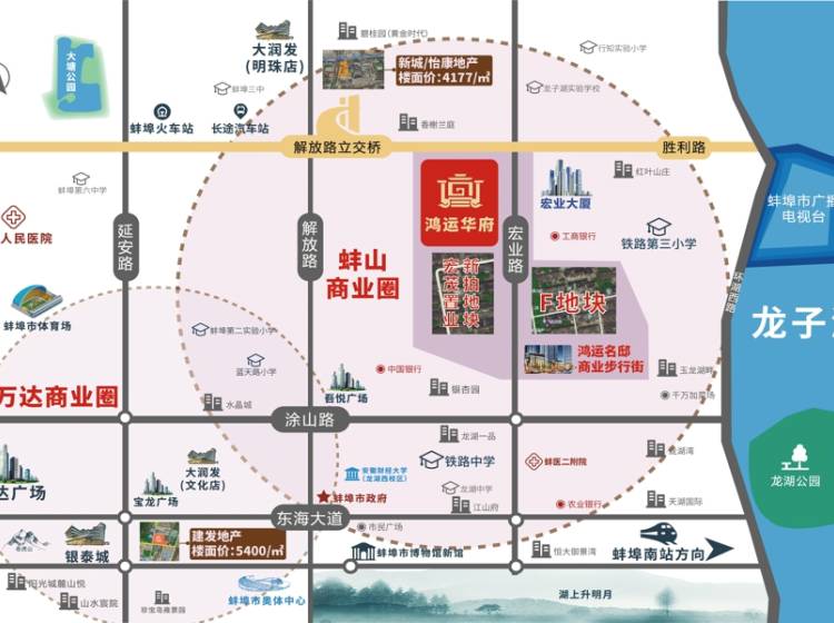 鸿运华府项目落户蚌山区核心发展区域,东侧毗邻龙子湖景区,南临政务板块,私享城市稀缺自然资源,书写城市湖居理想生活。项目依托得天独厚的资源优势,生活配套资源完善,千万加菜场,吾悦广场,蚌医二附院,龙湖幼儿园,铁路第三小学,铁路中学(含高中),安徽财经大学,市民广场、龙子湖体育公园等医教文体商单位环伺周边;邻近万达、银泰、宝龙广场等大型商圈,尽享生活便利。
