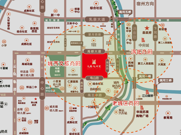 毅德城·大禹九州里文化旅游街区位于古中国“禹会诸侯”之地——蚌埠市怀远县区城西新区,以项目为中心,200公里经济圈内辐射南京、合肥、蚌埠、徐州等长三角区域重点城市。临近怀远县汽车站,依托城市大交通规划中的,云轨、亳蚌城际铁路、滕湖民用机场、蚌北高速公路等全方位交通枢纽,快速腾飞,辐射全国。 项目临禹都大道,西接禹德路,东临淮风路,南侧为龟山路,及怀远启王庙、禹王宫、蚌埠花博园等风景景点,地理位置优越。 本项目总建筑面积约16 万方,集自然、文化、艺术于一体,规划两轴一心一环道,九大业态覆盖其中,是当代怀远全业态文化旅游街区。项目不仅有民俗文化街区、地方美食特色街区、儿童教育与游乐,还将建设婚庆主题酒店、精装公寓及配备皖北地区古文明教育基地等配套。