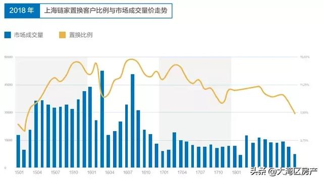 置换客亦是如此。下图是上海链家置换客户比例与市场成交量走势图,可以看到两者趋势非常接近,在市场成交量大的时候,置换客占比走高,而在市场冷淡的时候,则置换客比例走低。当然,置换频率增加,置换周期缩短,会进一步拉高市场上置换客比例,这一点不多赘述。