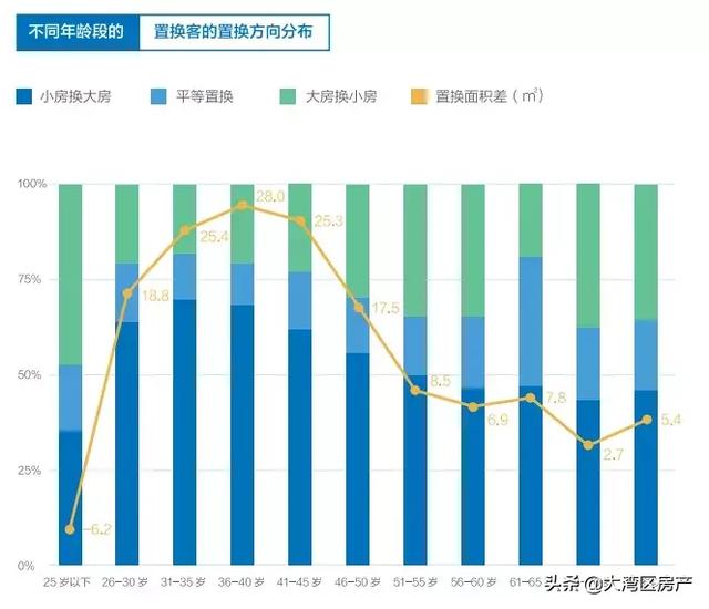 对于年轻人来说,更多客户选择小房换大房,占比较高的是30~40岁之间,置换前后平均面积差也达到所有年龄段较高,一次置换面积增加约30㎡。而随着年龄的增加,则有更多的客户选择大房换小房。