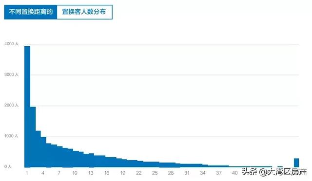 从置换距离来看,置换的平均距离为10km,大量的置换客都集中在短距离置换的部分,其中,21.02%的客户置换距离不足1km,47.17%的客户置换距离不足5km,64.20%的客户置换距离不足10km。
