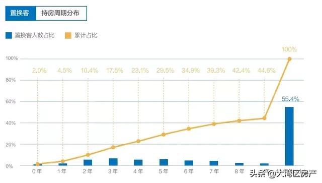 从时间分布上来看,以10年为界,持房10年及以上再换房的占比为55.4%,5年及以下的占比为29.5%,也就是说,有45%的置换客选择在10年内换房,有接近30%的客户选择在5年内换房。