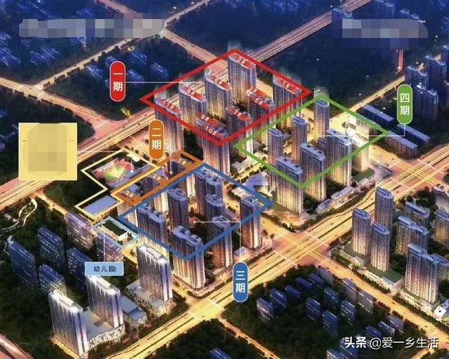 今天在朋友圈看到一个销售发的楼盘图,正好可以直观地看到区别:一期位于整个项目的西北角,二期三期相对一期是靠南的位置,一期的房采光多少会受二期三期的房一些影响。二期三期靠近幼儿园。三期四期靠近城市主要道路。