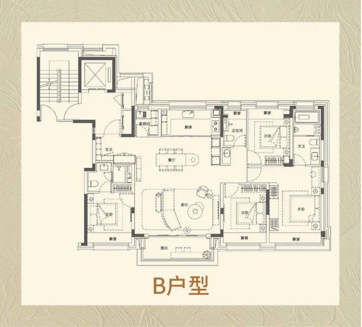 除了A户型,184的B户型则非常符合传统认知:经典的南北向,标准的超大面宽、短进深,克服了市区很多新房由于受地块限制,在设计时总是有一些空间不能尽如人意的弊端,四个空间朝南一定排开,全屋全明设计,没有死角,无论是空间感还是动线都很符合对户型要求较高的买家的需求。