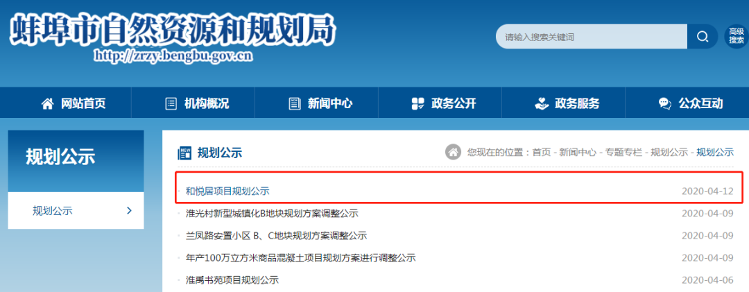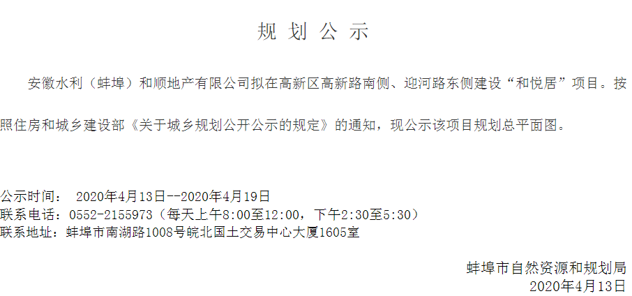 近日,蚌埠市自然资源与规划局公示“和悦居”项目规划公示。