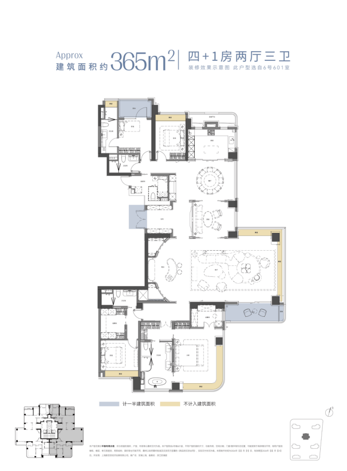 建面约365㎡4+1全景舱户型,更是将光与空间的融合做到了极致。全屋约60 米超长采光周长,以环幕级采光界面,让阳光成为空间的原生底色;约80㎡全景舱大方厅,无界贯通的空间格局,实现了家庭欢聚、圈层社交的全场景适配。三套独立全功能房设计,保障居住的私密性与尊崇感,完美适配多代同堂的家族居住需求,成为可世代传承的塔尖恒产。
