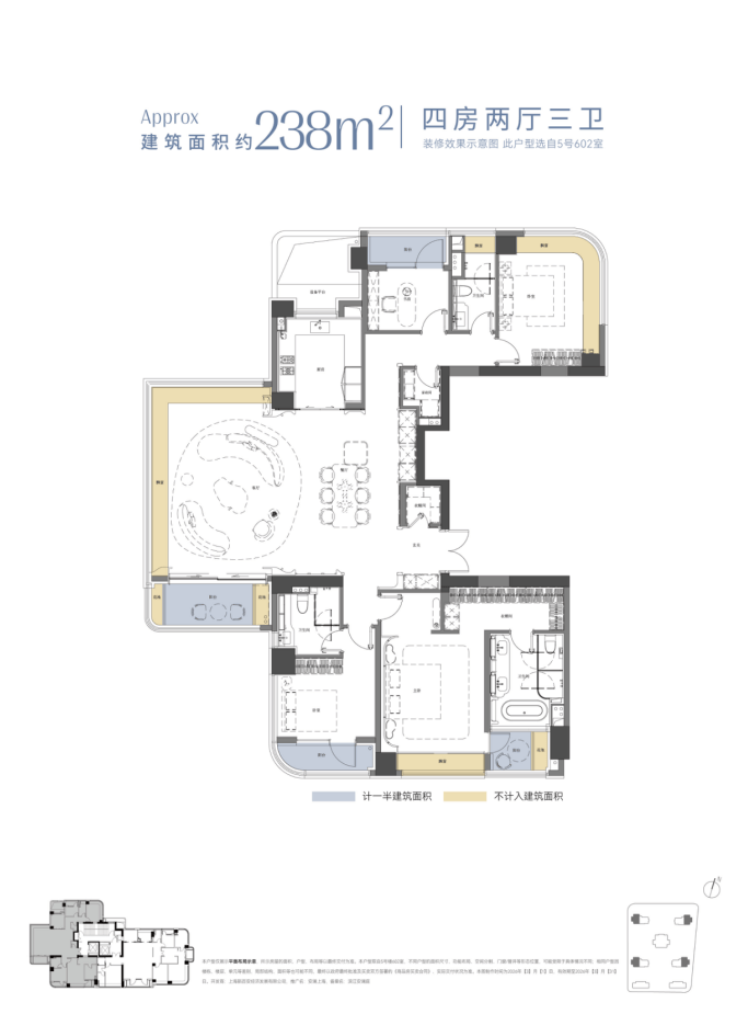 建面约238㎡四房三卫全景舱户型,全屋约46 米全景采光周长,客厅打造连续约 17 米三面采光界面,成就 IMAX 级环幕视野,搭配3.45米奢阔层高,让自然光无死角渗透;朝南双主卧套房搭配全屋六大系统化收纳空间,兼顾家族居住的私密性。