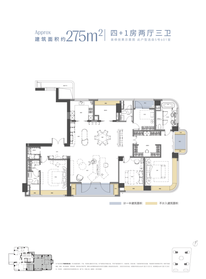 建面约275㎡4+1 房户型,以约22 米南向极致面宽,实现了超越市面 400㎡级大平层的采光尺度,约 80㎡奢阔餐客通厅搭配 7.2 米客厅开间,形成无界通透的社交聚场,既容得下三餐四季的烟火日常,也撑得起家族宴请的排场体面。
