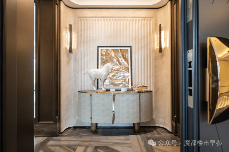 例如入户玄关铺设有“石材皇后”鱼肚印象,这种级别的奢石在很多顶豪项目中通常仅作局部镶嵌