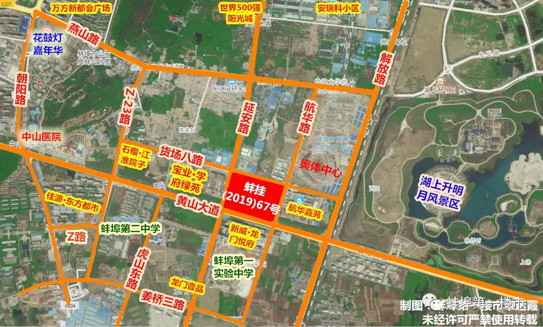 从上方看,蚌挂(2019)67号地块紧邻蚌埠聚云商务广场、新二中,整体形状方正。