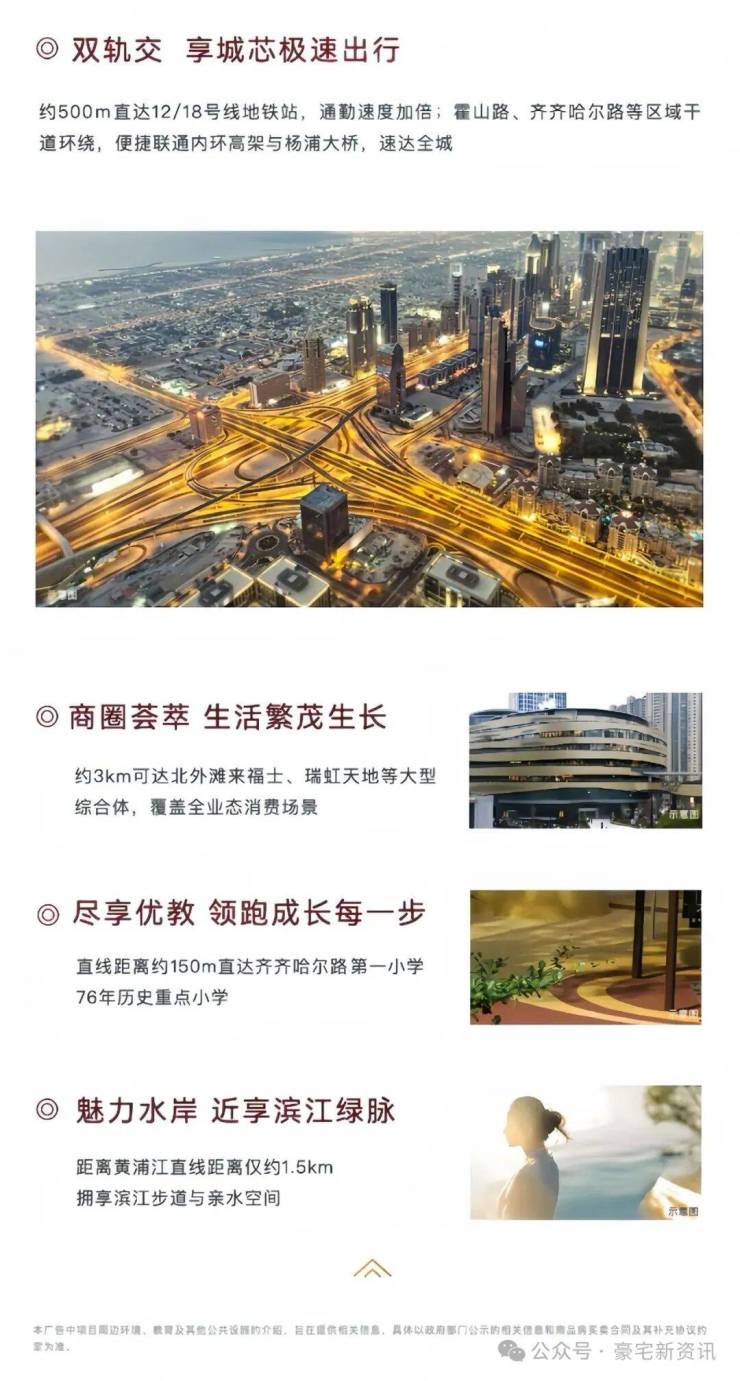 项目直线距离12/18号线江浦公园地铁站约500米。霍山路、齐齐哈尔路等区域干道环绕,便捷联通内环高架与杨浦大桥,速达全城。项目直线距离黄浦江仅约1.5km,拥享滨江步道与亲水空间。