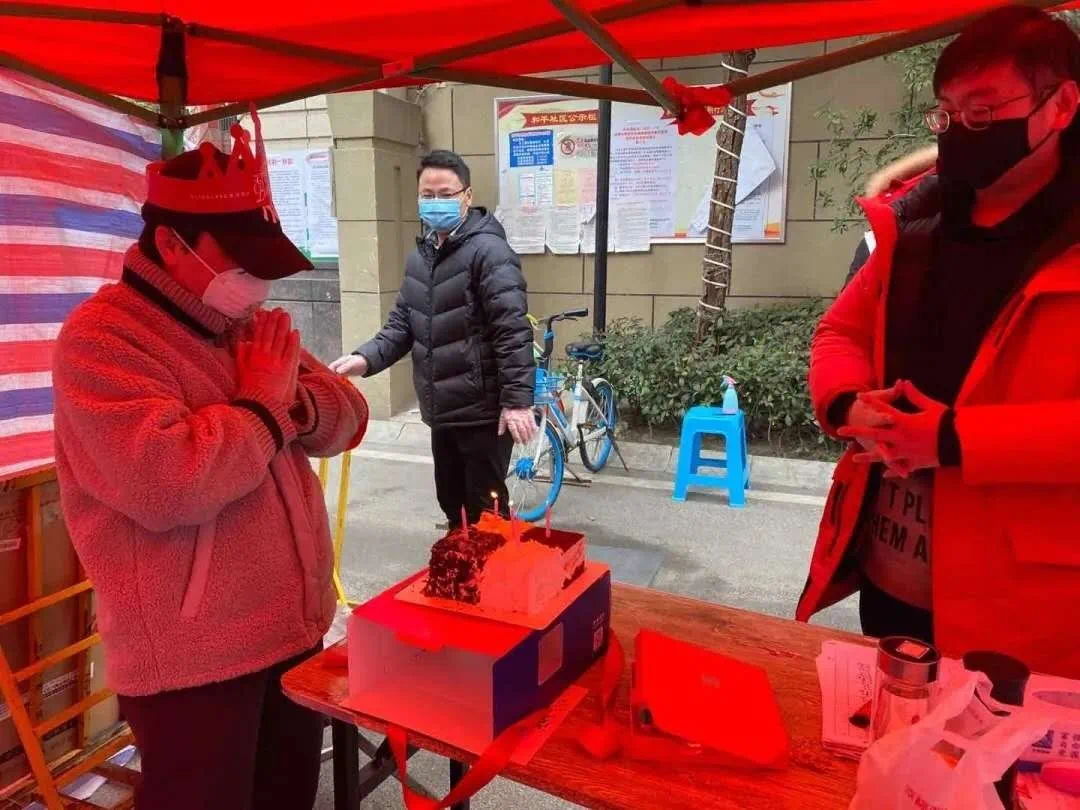 2月26日,对于黄庄街道防疫志愿者陈小娟而言是意义非凡的,因为今天是她的生日,本应在家中与家人度过生日的她,如今却与“战友”顶着寒风,为本次防疫工作贡献着自己的力量。和平社区负责人得知今天是她的生日后,特意为她送上生日蛋糕,小区邻居们得知后,纷纷向她表达生日的祝福。