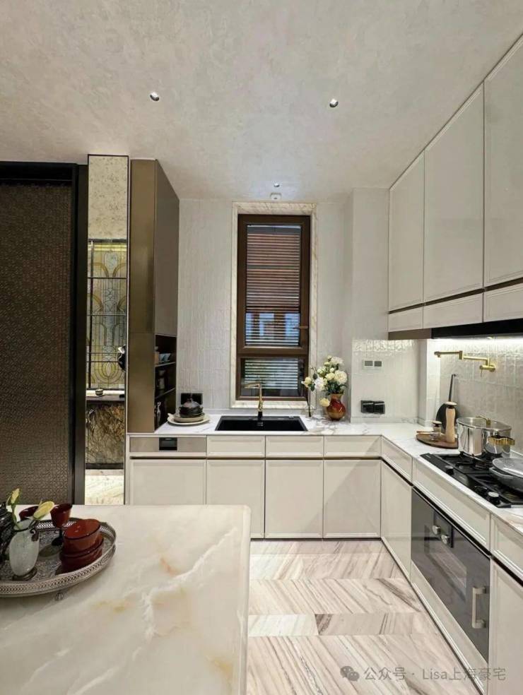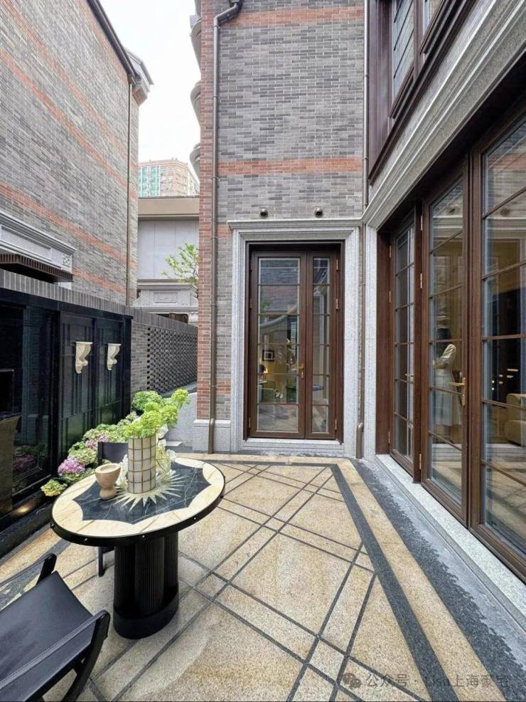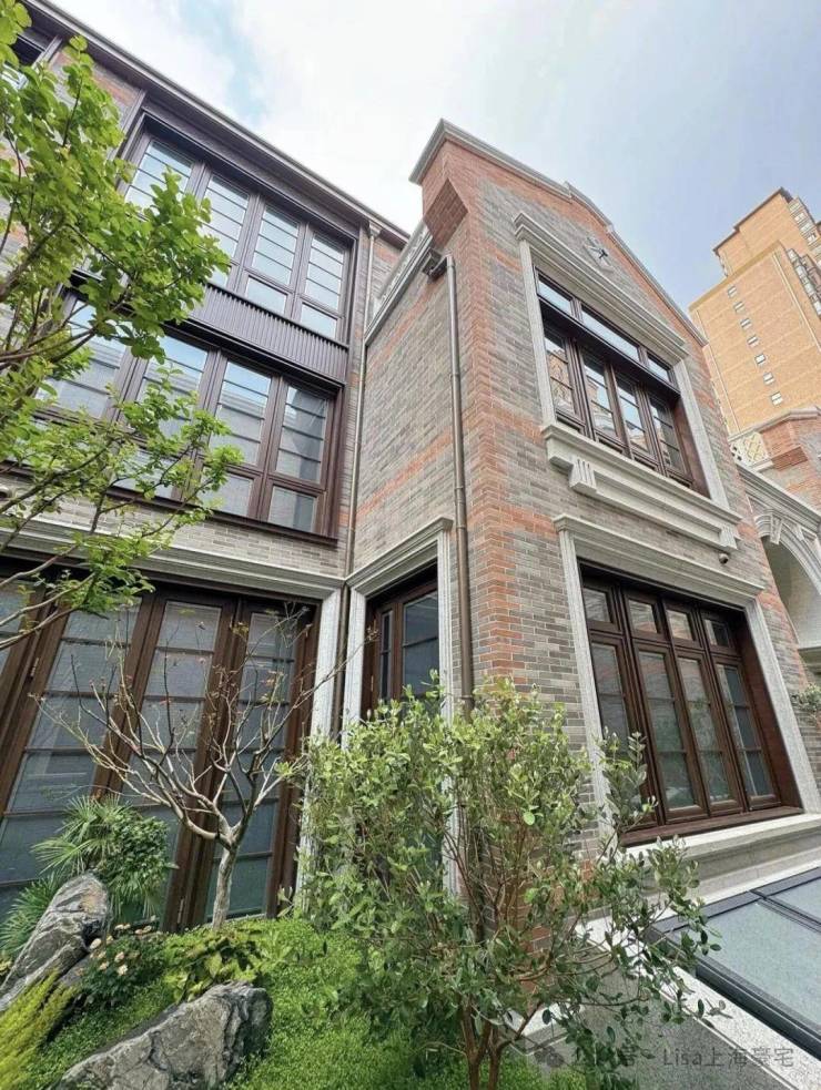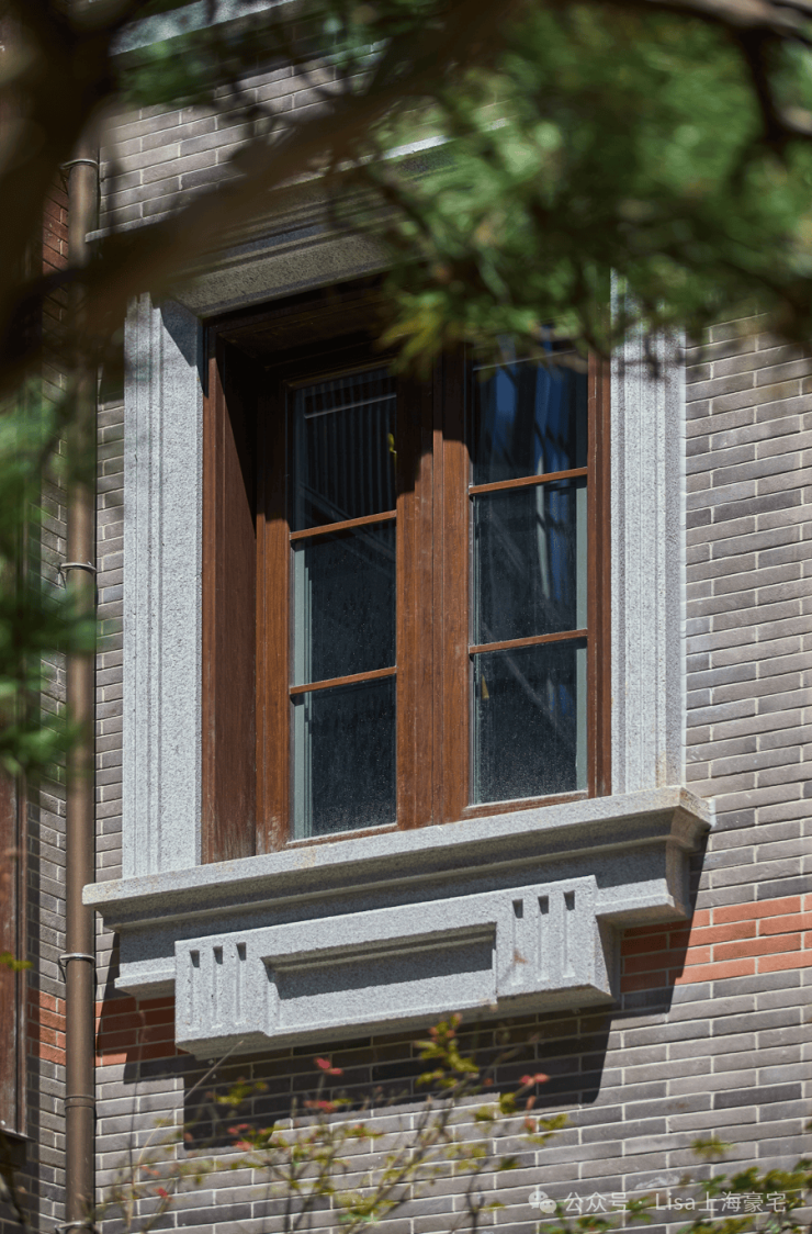 而在与砖连接的窗体,保利永兴里别墅的窗框及四周采用了仿木纹铝型材和铝板,门窗套为浅色石材。