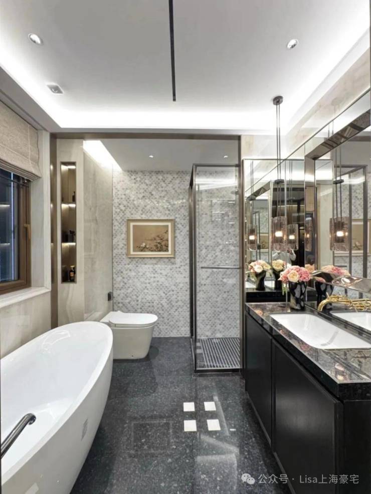 Prada绿奢石镶嵌于门厅与水景,地面铺装与建筑立面相呼应,菱形地花+海棠纹镶钻拼花,入户铺贴范思哲黑奢石。