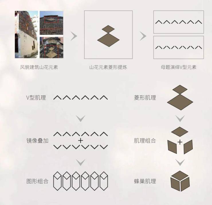 永兴里从老城厢建筑中提炼出“菱形山花”作为超级符号,将其转化为门头雕花、地库导视甚至园林小品的视觉母题。