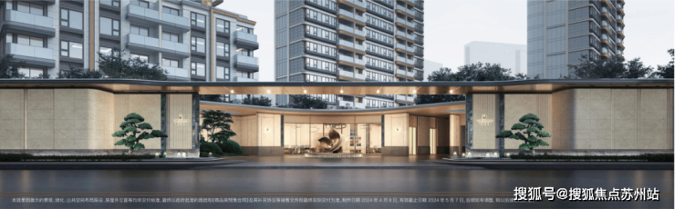 酒店式门廊作为归家的第一道风景,招商臻境以空间大尺度与高级奢石的材质使用将尊崇的归家礼遇感拉满。招商臻境售楼处电话:400-8297-773 近50米宽,高度约5.3米高,开口约11米长的高规格酒店式大门。选用了贝金米黄石材作为墙面主材,墙裙用印度蓝石材做装饰。两侧甄选了两颗名贵的罗汉松,有着恭迎归家的美好寓意。