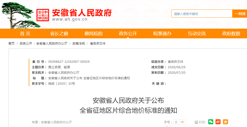 7月20日,安徽省政府网站发布《安徽省人民政府关于公布全省征地区片综合地价标准的通知》。通知全文如下: