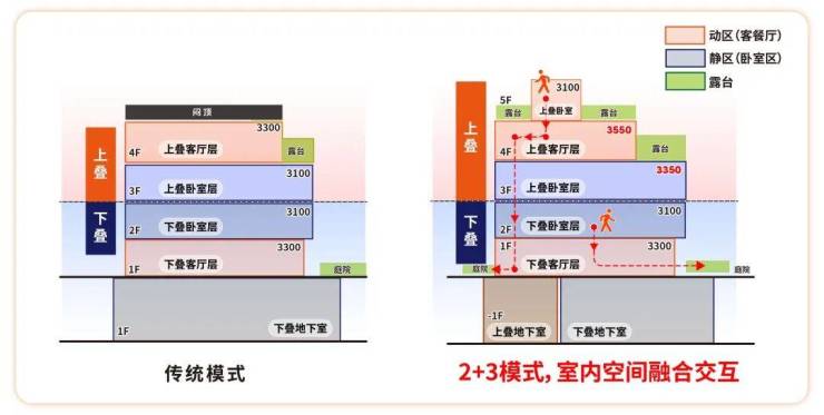 彻底抛弃传统上叠 “顶层 + 阁楼” 的鸡肋设计,上叠为3-5层全标准层高配置: