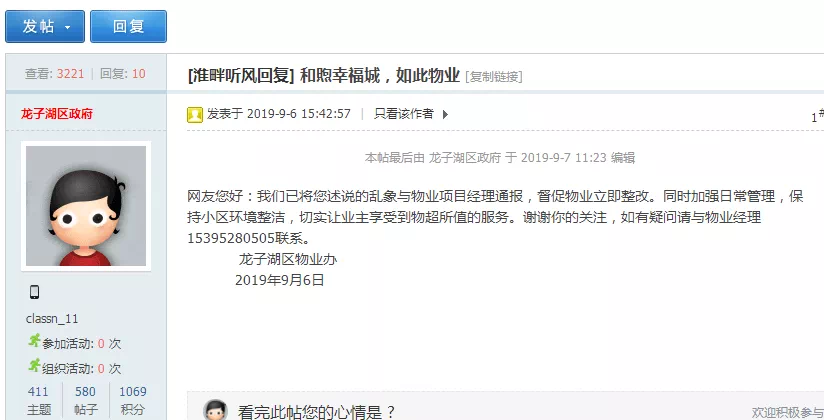 而龙子湖区政府也对该贴进行了回复:称该乱象与物业项目经理通报,督促物业立即整改。同时加强日常管理,保持小区环境整洁,切实让业主享受到物超所值的服务。