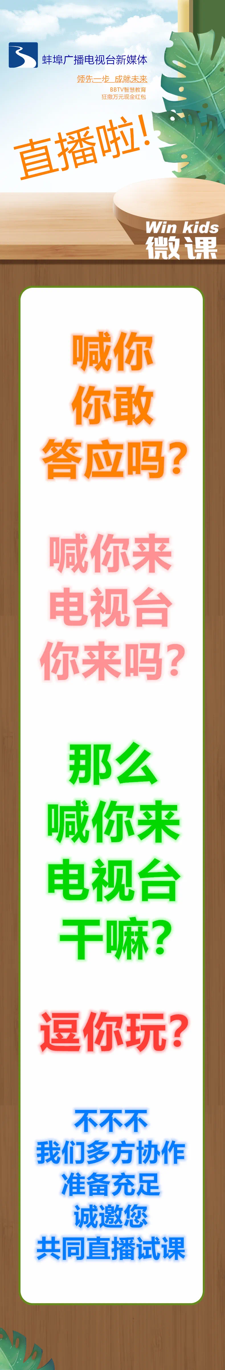 最后,还想告诉您,8月6日19:30分登录蚌埠广播电视台新媒体直播界面参与直播,届时,精彩课程介绍、万元红包发放、网友互动留言等火爆妙趣的环节接连不断,惊喜连连,我们真诚的在这里,期待您的光临。
