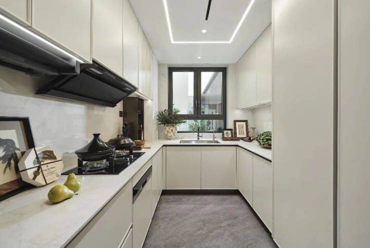 厨房配备西门子厨电、弗兰卡水槽;标准的U型布局,冰箱位置外置之后收纳空间全部做满,完全可以容纳2-3人一起操作,毫不拥挤。