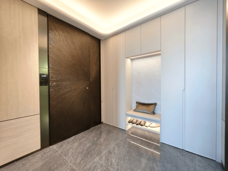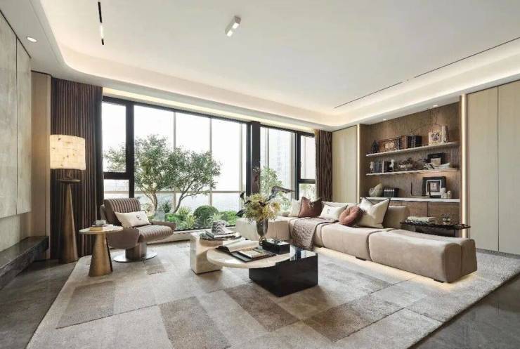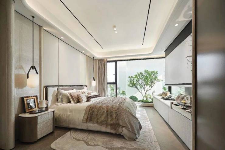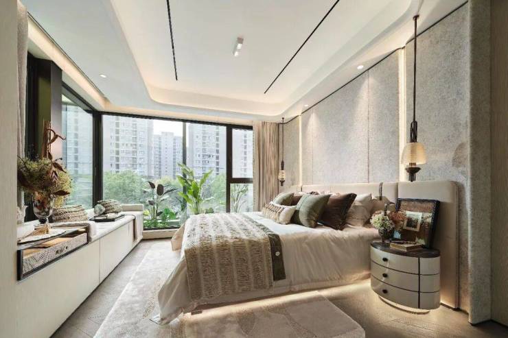 摒弃千篇一律的冷峻盒子,星屿立面溯源海派经典,进行超配美学迭代。标志性的“海派弧镜” 与蜿蜒水岸相映成趣,米色石材、铝板与金属线条的精致混搭,勾勒出挺拔优雅的轮廓。尤为难得的是,住宅标准层层高达3.05-3.1米,以别墅级的空间尺度,呈现开阔从容的生活气度。