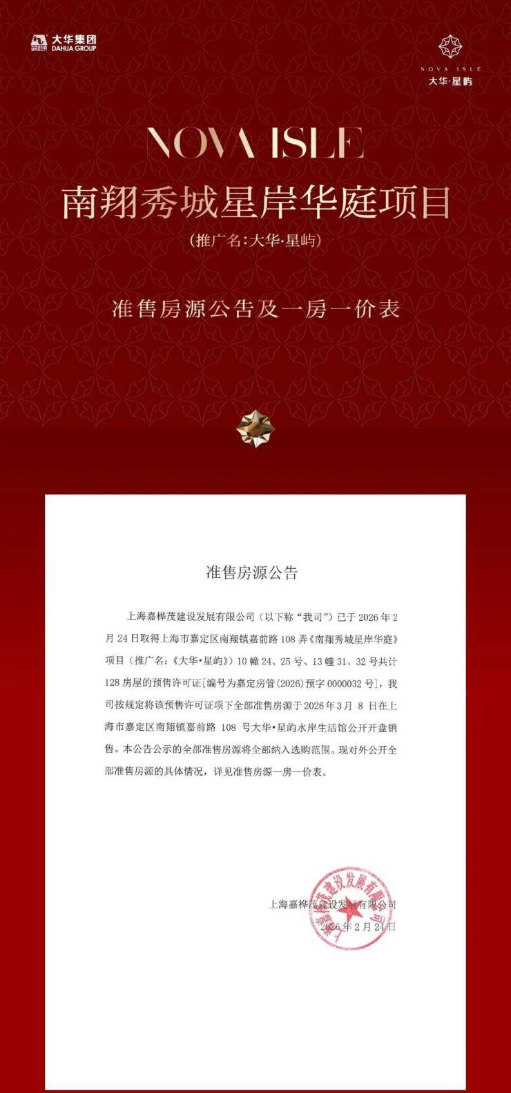 认购地点:上海市嘉定区南翔镇嘉前路108号大华星屿水岸生活馆;