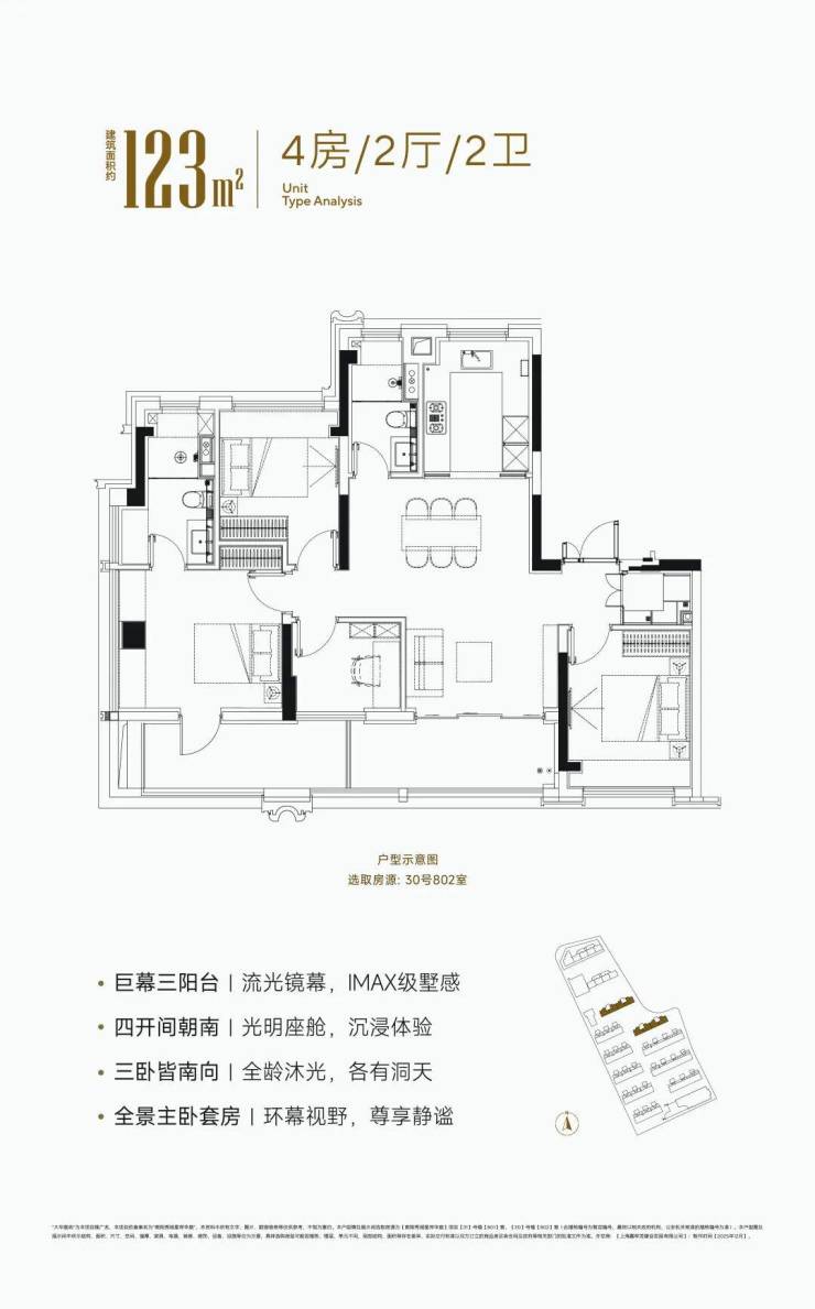 约123m²户型,赠送面积约17m²,实得率约92%。堪称同面积段的功能与尺度标杆,满足各类家庭改善居住。四开间朝南,面宽达约13.3米。独创独立“800库”家政空间,将洗衣、清洁、收纳集中整合,彻底解放公共区域。客厅可与南次卧联通,轻松变换为约6.3米奢阔横厅,场景随心定义。主卧套房配备独立衣帽间、奢阔主卫,尊崇感十足。
