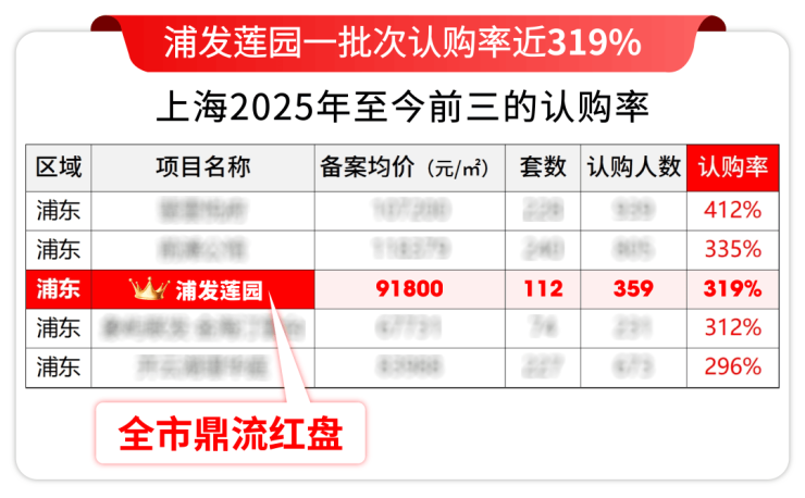2、浦发莲园一批次112套房源吸引359组认购,认购率高达约 319%,位列今年新房认购率TOP3!