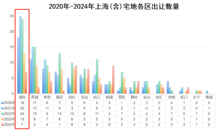 更为严峻的是,浦东新房供应市场还在持续收缩,土拍地块数量年年腰斩!