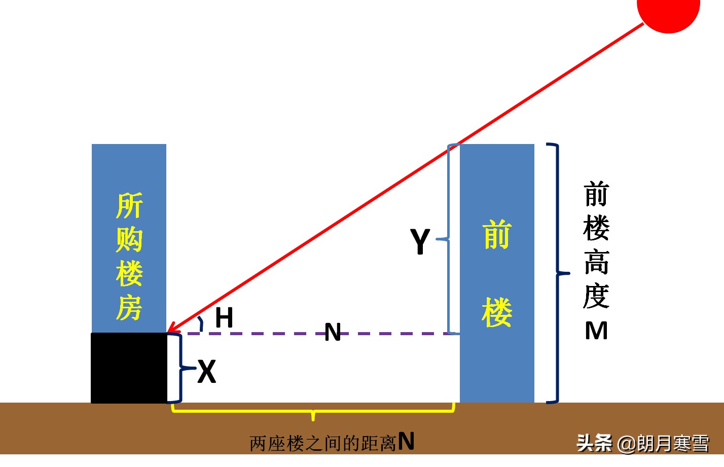 6,如上图所示,前楼高度M,前后楼间距是N,正午太阳高度角H,被前楼遮挡太阳光的楼层高度是X。