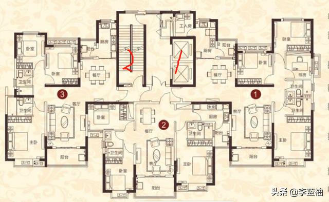 如上图所示,东户紧贴电梯1,西户紧贴楼梯2(在此我们先不考虑东户工人房的问题,姑且认为东西户户型一致)。