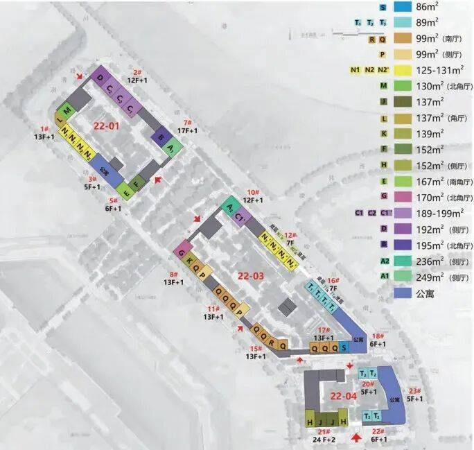 22-01地块占地面积1.1万平方米,总建筑面积5万平方米,包括4栋住宅楼、2栋商业;22-03地块占地面积1.6万平方米,总建筑面积6.7万平方米,包括7栋住宅楼、2栋商业;22-04地块占地面积0.9万平方米,总建筑面积3.8万平方米,包括3栋住宅楼、2栋商业。