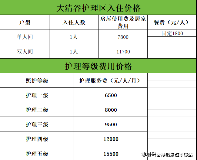 护理区只有两种户型,并且都只能入住一人,每个人每月的餐费固定为1800元,护理等级分为五种,需要护理的等级越高,所需的护理费自然是更贵的。