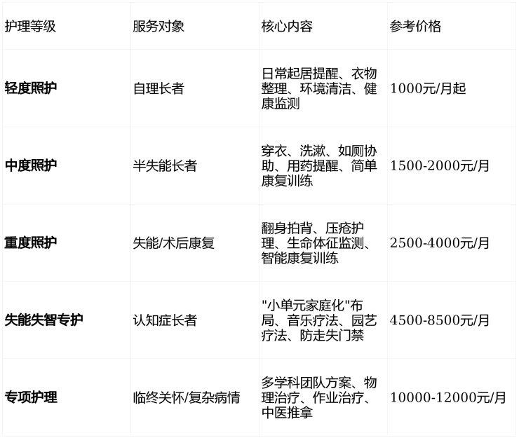 护理费:1000-12000元/月(按五级护理体系)