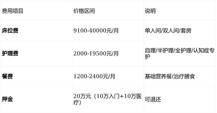 月均总费用:10000-20000元(根据护理等级和房型)