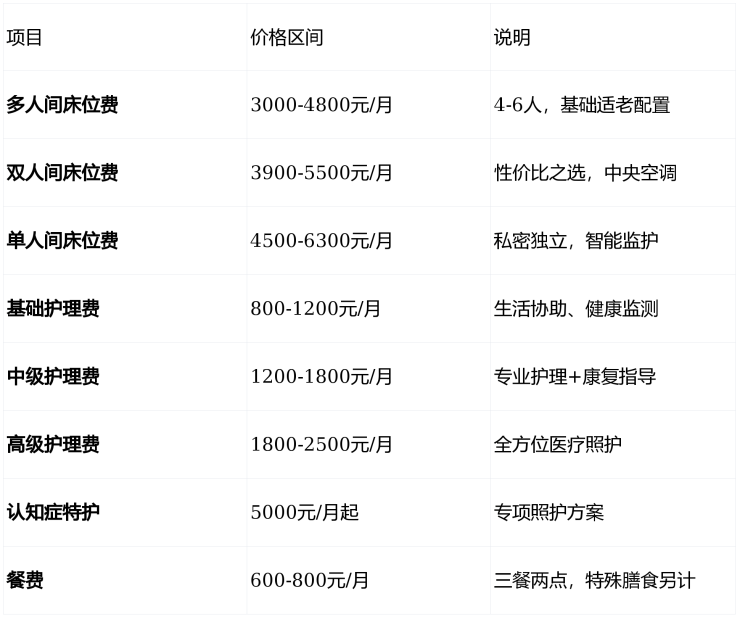 自理型(1500元/月起):健康监测、用药提醒、基础生活协助