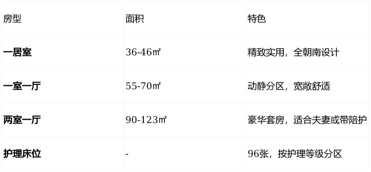 特别亮点:支持"1+1"夫妻共住模式——即使一人失能,夫妻也无需分离,在同一社区完成从独立到护理的无缝切换。