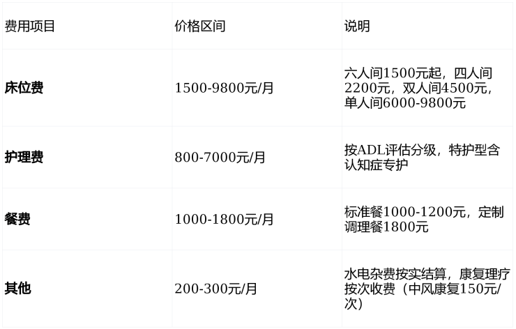 采用"床位费+护理费+餐费"三段式透明计价,无隐形消费