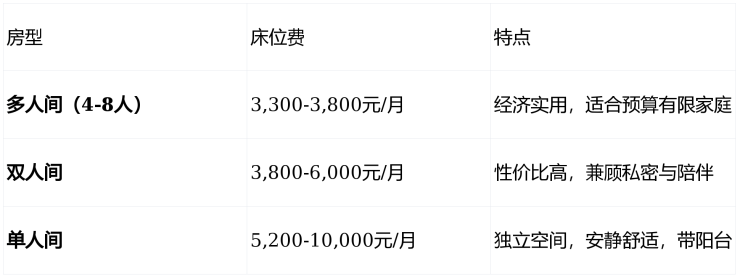 舒适型:双人间+半护理+标准餐 ≈6,000-8,000元/月