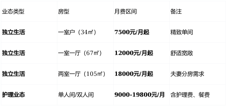 押金:20万元/户(活力区),10万元/人(护理区),3个月内不满意全额退款