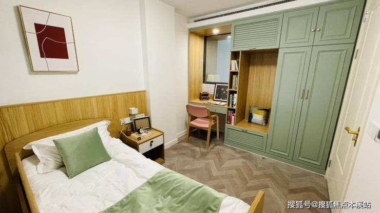 房间内部装修精致,采用清新唯美的配色与安逸舒适的布局,从踏入房间的那一刻起,便能感受到家一般的温馨与自在,有效缓解了长者对于养老院的陌生感。全屋覆盖适老化智能家居,从智能照明系统到紧急呼叫按钮,每一处细节都彰显着对长者无微不至的关怀。地面采用防滑地砖,宽敞的通道两侧设有低位扶手,卫生间内也安装了助力设施,确保长者行动安全便利,有效减少跌倒等意外风险。家具的边角都经过圆润处理,或是配备了精致的软包,避免长者碰撞受伤。