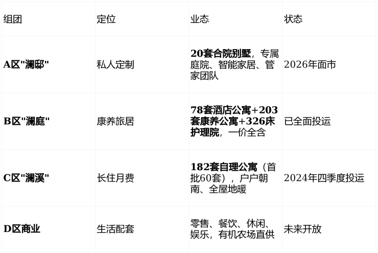 ✅全周期业态:四大组团(澜邸/澜庭/澜溪/商业),从旅居到长住,从自理到护理,一站式不换房