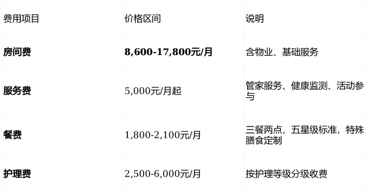 实际月支出参考:自理长者约9,500-11,000元/月(含房费+餐饮+基础服务+健康监测+1500场活动),性价比显著高于同地段高端养老机构。