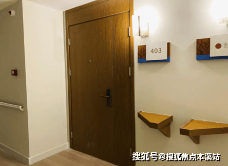 而且大家注意房门口都由安装一个三角台,老人可以在上面安放自己的物品,以增强对自己房门的识别。